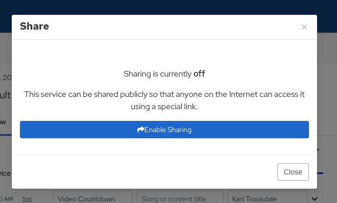 At any point, you can "unshare" the worship flow by re-following the steps above and clicking the "Disable Sharing" button.