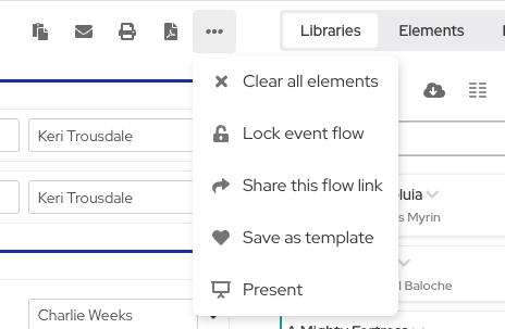 General details about your worship flow can be shared to anyone on the Internet using the three dot "Other Options" in the upper right at the top of the Event Flow. Hover over the three dots and click "Share this flow link."