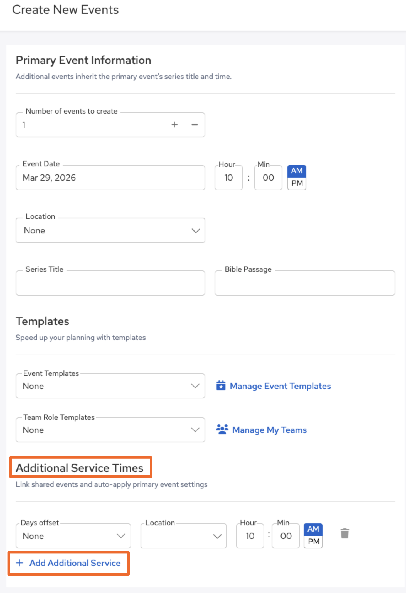 This is done when you "Create an Event" there is an option to add "Additional Service Times" in the bottom left of the screen. To navigate to this you'll go to Events> Create New Event. You can link shared events and auto-apply primary event settings. Click the + Add Additional Service (blue link) to add your additional events.
