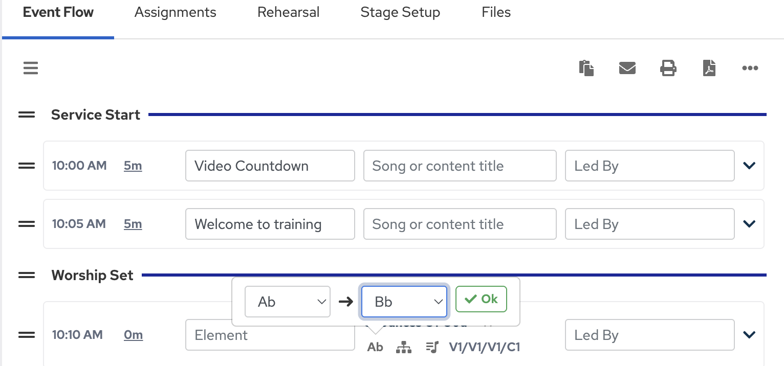If the ending key of a song will be different from its starting key, you can easily indicate this in the worship flow. Just click on the key that is currently set for the song in the worship flow (or the "b/#" icon), then set your starting and ending keys. (If there is not a key already listed for the song, there will be a n/a icon that will achieve the same result.)