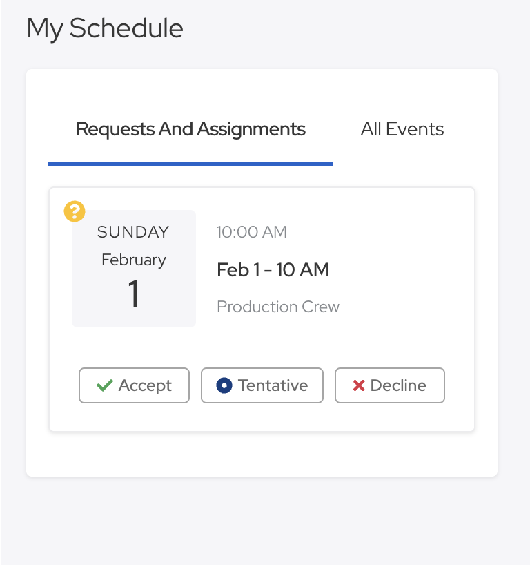 You can Accept, Decline, or mark your availability as Tentative. If you have already selected your response via the email notifying you of your assignment scheduling, you will not have to do this again. This also applies to your text response if you have that set up within your profile settings (to turn this on: click your Name> My Profile> Communication Settings)