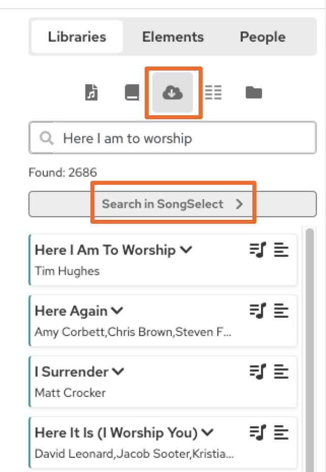 To use the integration in your Event Flows, navigate to the Event Flow page for any service, then click the right panel. It defaults to the "Libraries" tab, and from there, you will see a cloud icon with an arrow. Once you click that, you can begin typing in a song name, then click "Search in SongSelect," and it will bring up a number of song options to use in your Event Flow.
