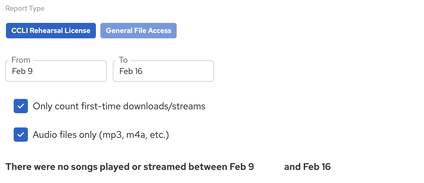 As shown in the screenshot above, you can filter the results for your report by the type of Access, such as streamed, downloaded, or either, as well as by date.