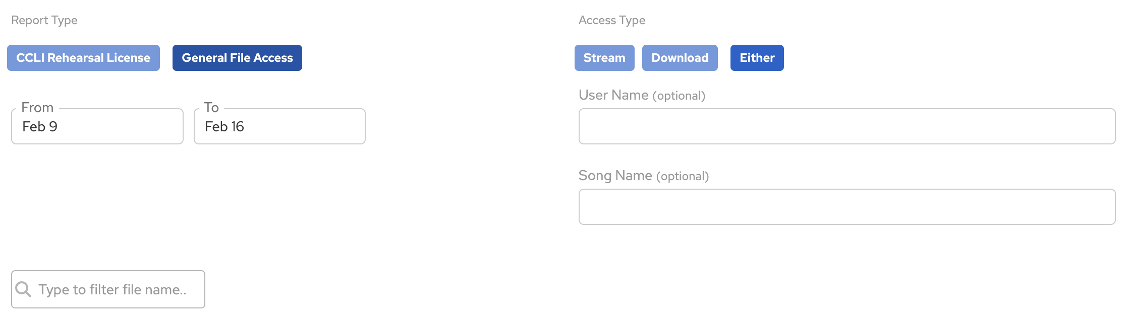File Access Reports can be found under Library> Files and then clicking the button "View File Access Reports" in the upper right, you can get a report by CCLI Rehearsal License or by General File Usage.