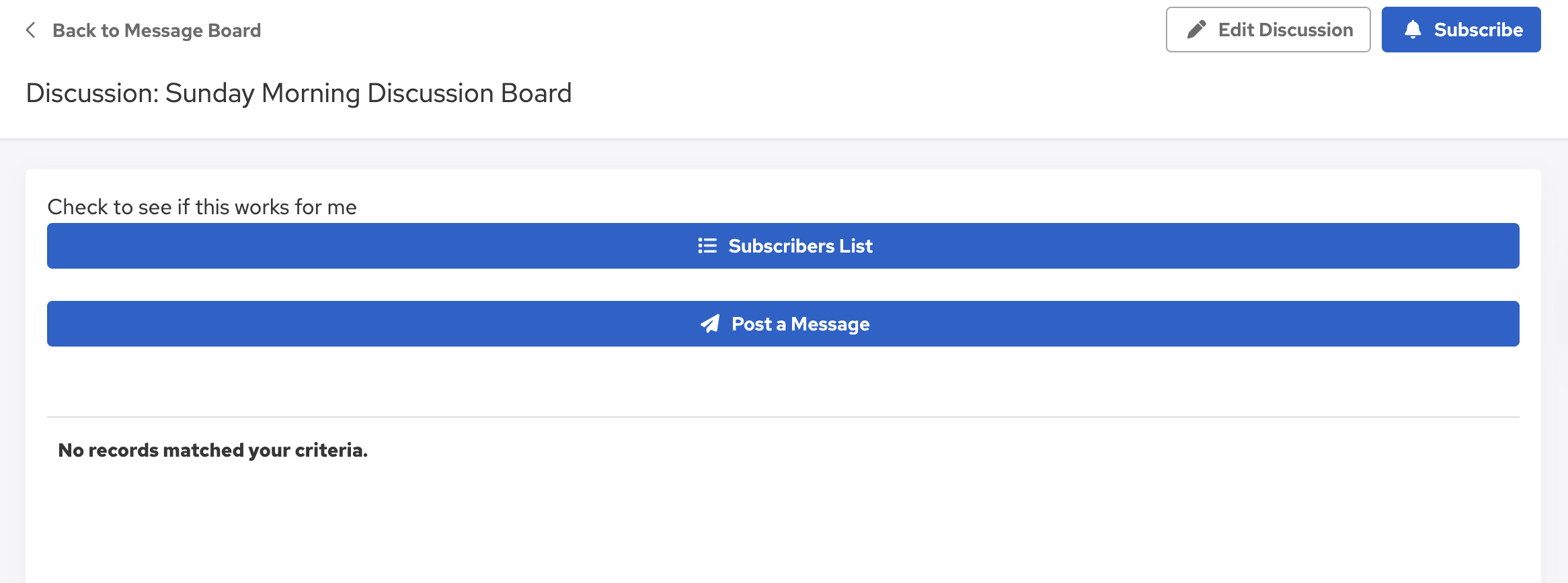 The Service Planning Message Board allows you to create multiple discussion "threads" for your teams (Planners and Helpers). Access to each thread can be configured to allow specific people to read, others to read and post, and others to not have access to it at all. Users with read access can subscribe to a discussion, which means they will be notified via email (and possibly text message - if configured) when a message is posted to that discussion.