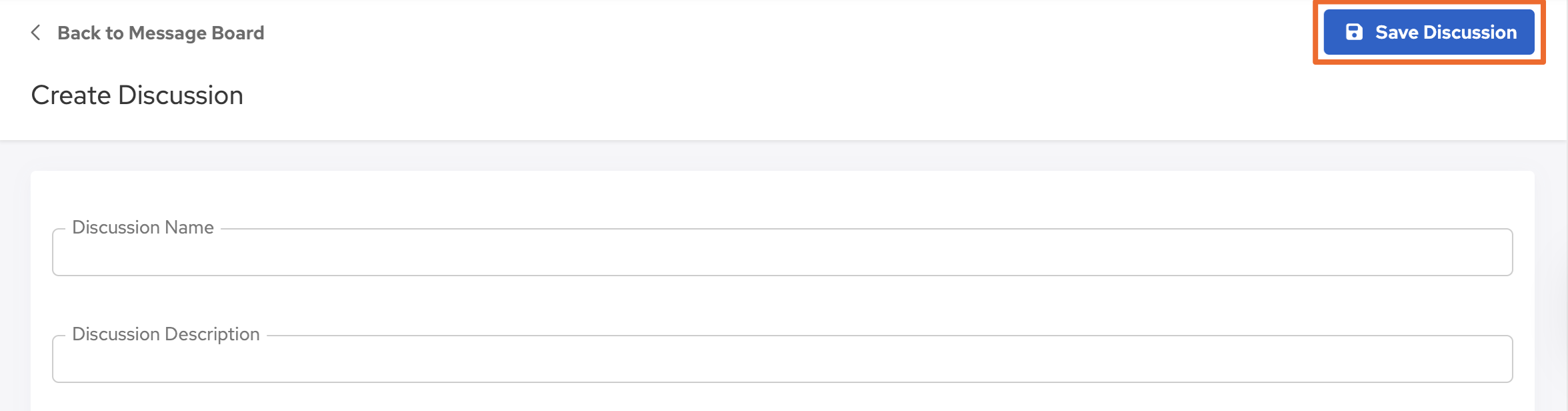 - Next, click the Create Discussion link (top right). Fill in the form and click the Save Discussion button.