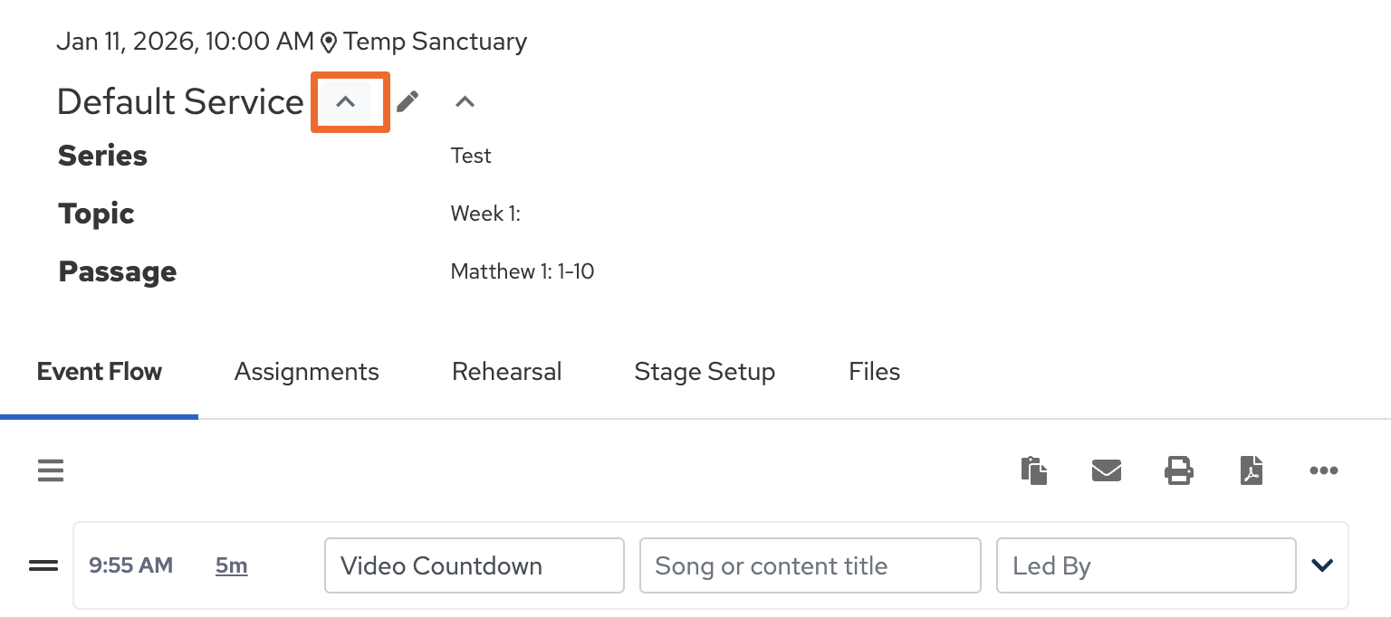 When a Bible passage is entered in the Passage field of the service details, an external link is created that can be found under "More Event Information" located at the top of your Event Flow.