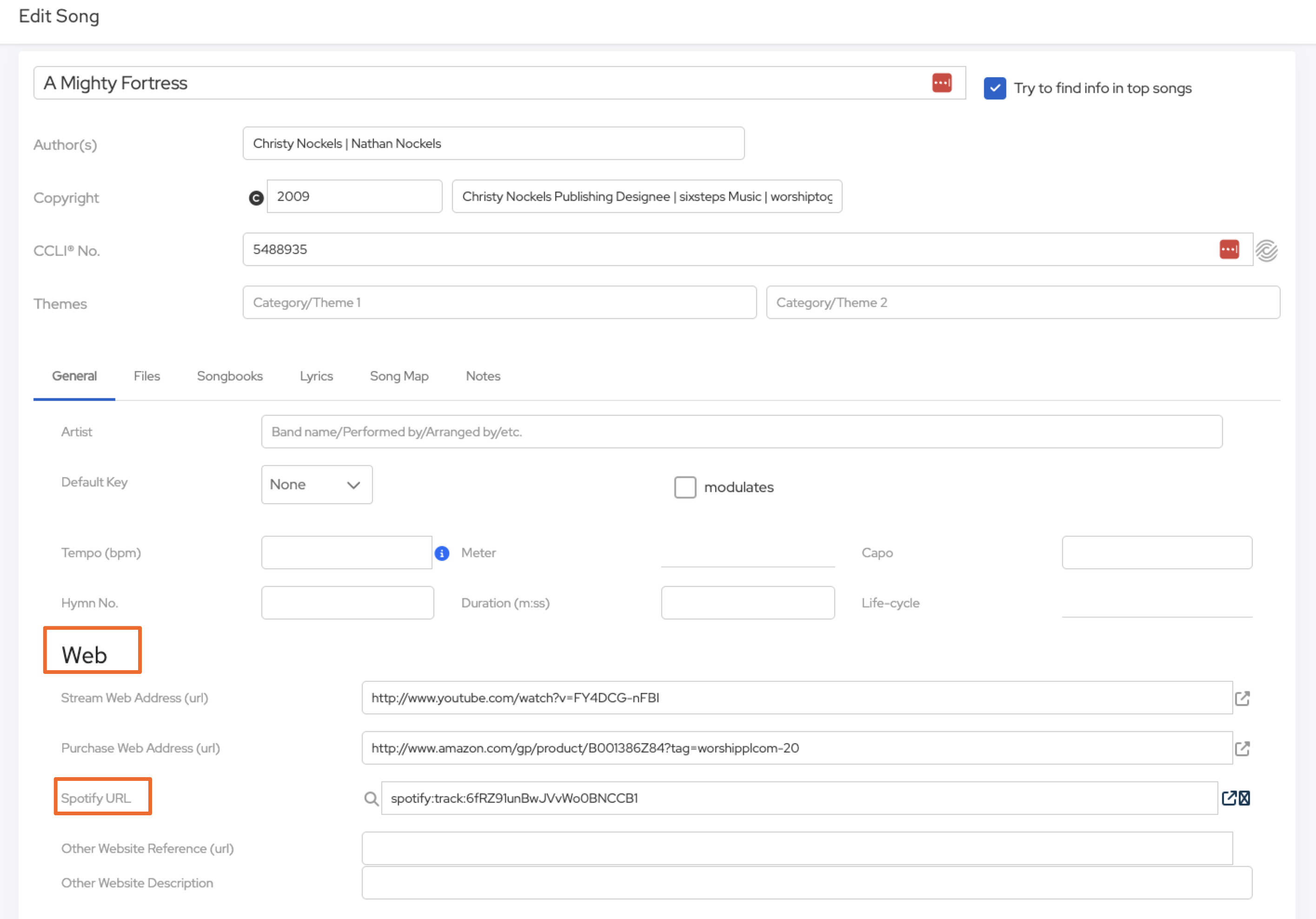Spotify "integration" into Service Planning is that for each song there is a special Spotify link (kind of like a link to a website) that tells your computer to open Spotify and play a specific song. If you click to edit a song, scroll down to the "Web" area, and enter the link to a Spotify song, you can save the changes.